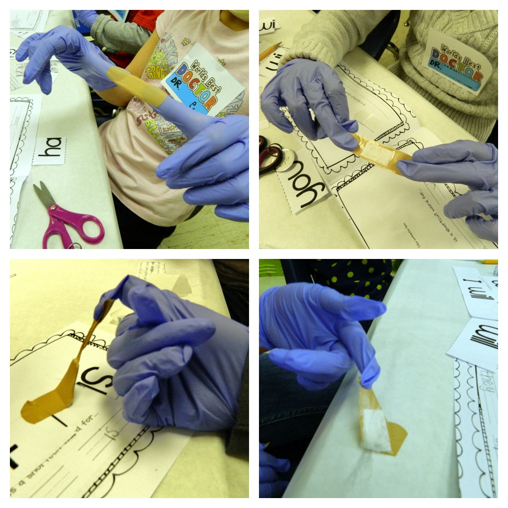 Each operating room was covered in white bulletin board paper (or white table cloth), a surgical mask (Amazon affiliate link), surgical gloves (Amazon affiliate link), glue sticks, knives (scissors), patient records, patients, and a tray of apostrophes (bandaids).
