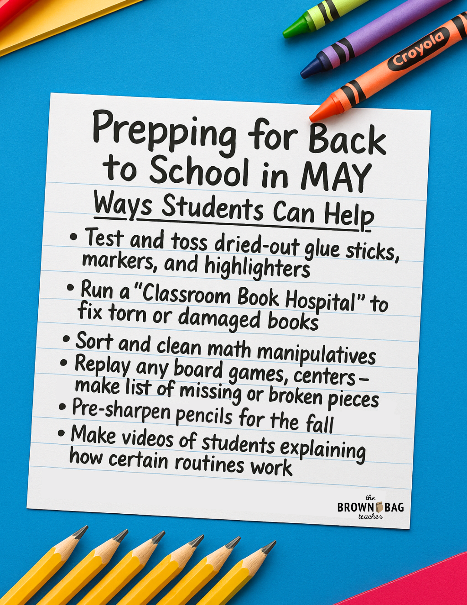 Have students pre-sharpen 100+ pencils for the fall.