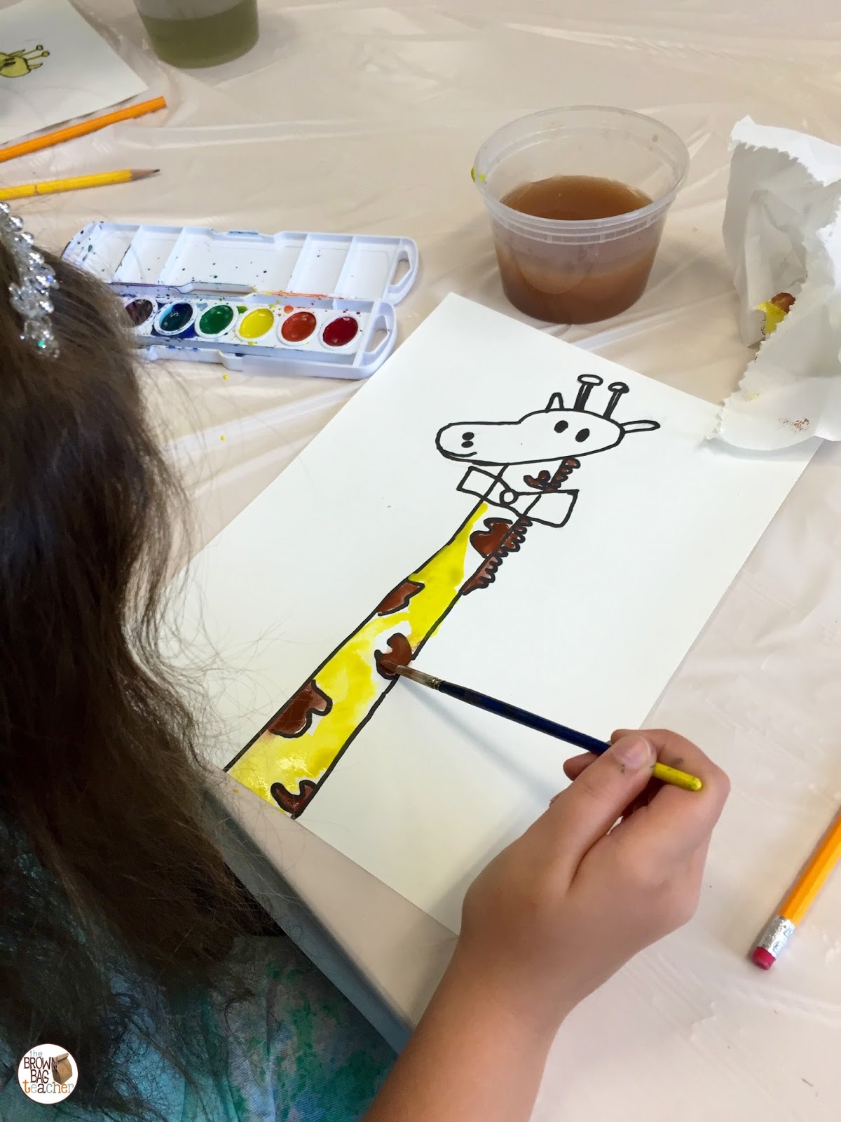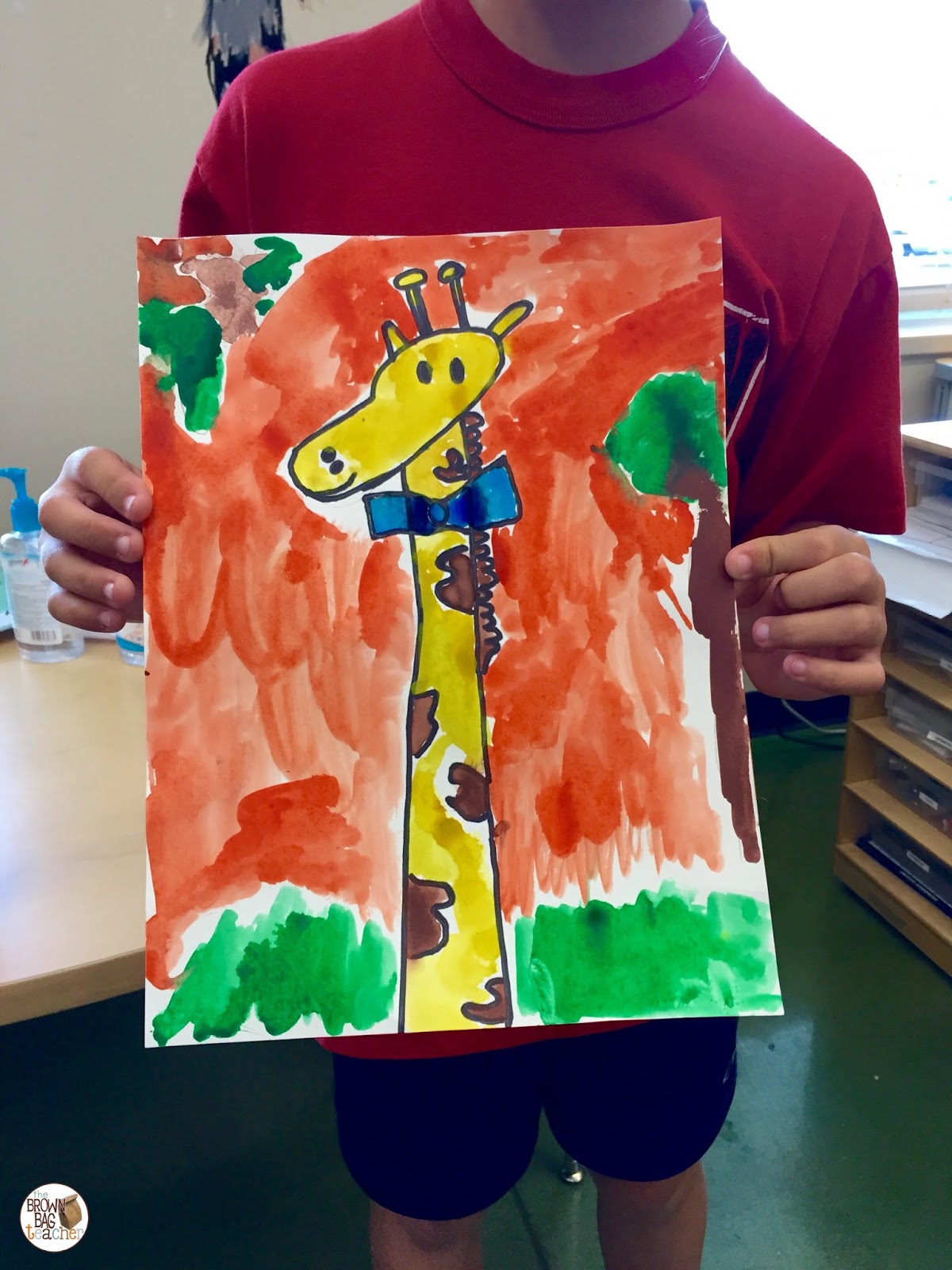 Following our traditional water-color routine (you can read about that here), I modeled a giraffe on the board – shape by shape. We chant the shapes and then, students draw them. Then, students trace over their work in sharpie (I put plastic table clothes on the tables for protection). After students have traced, they go back with an eraser and erase any pencil marks.