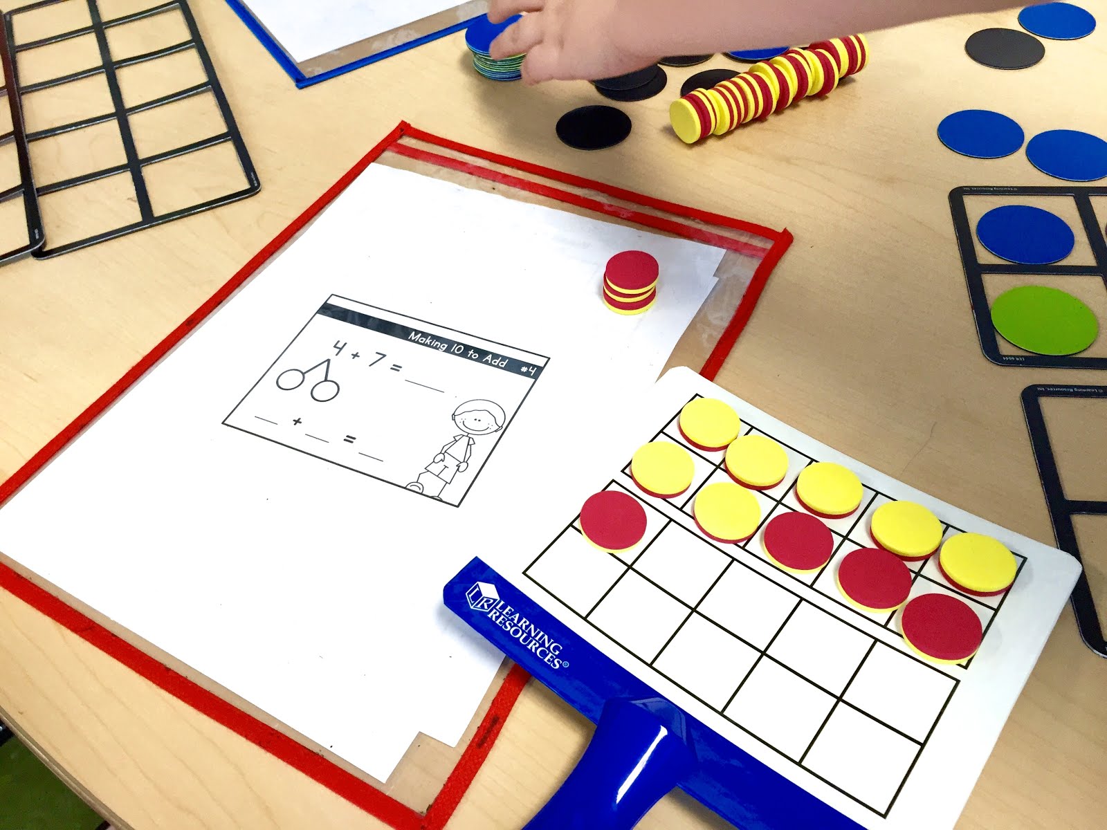 The perfect way to save paper, dry erase pockets are perfect for reviewing or practicing skills. They are also great for creating paperless math centers. Slip in one recording sheet and students can write straight on the pocket. Below you see my friends making 10 to add. When they finish, students can take a picture of their work for you to look at later, or they can share it during the next mini-lesson in between Guided Math rotations. Sheet protectors also work as a less sturdy option!