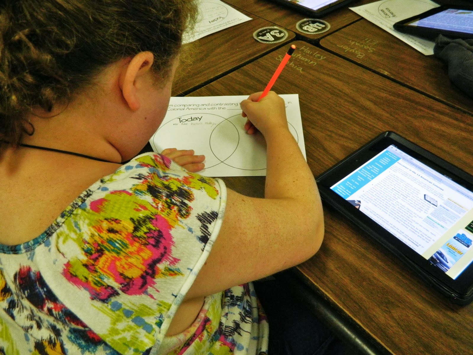 In the first station, students used our iPads to scan a QR code. (I find that using QR Codes to link a website is SO much easier than sending students to Google or another search engine looking for a specific topic or article.) The QR code brought students to Social Studies for Kids where students could choose what they wanted to learning about – church, school, farm, park, food. After reading the nonfiction article, students compared/contrasted that part of Colonial life to life today. {Click here to grab the recording log and QR Code for free}