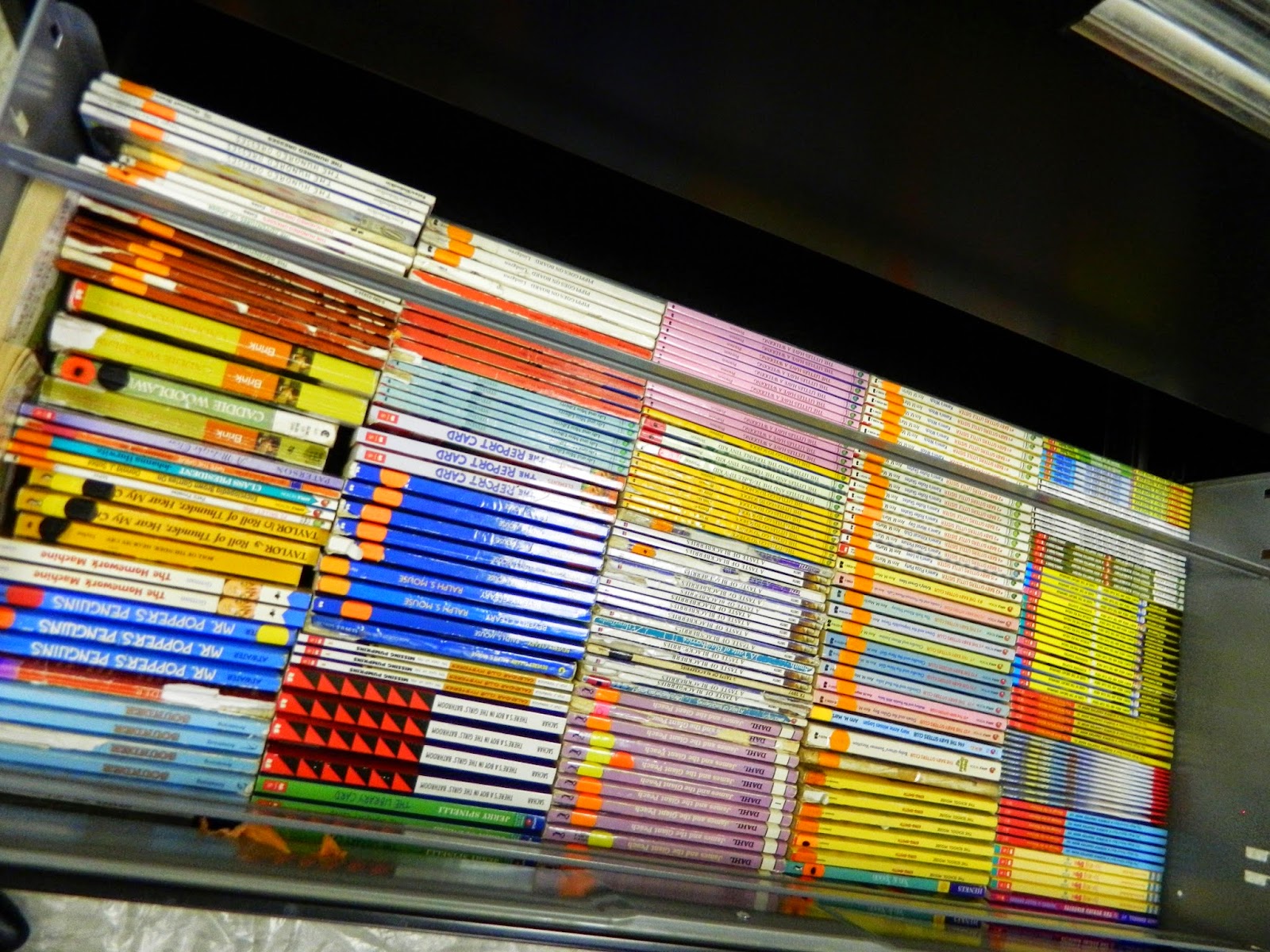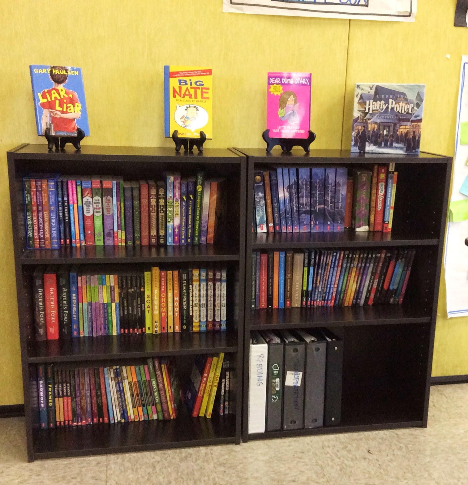 Lastly, I place my REALLY low books (Horrible Harry, Clementine, Nancy Drew Clue Crew, Magic School Bus chapter books) in the bottom drawer of my black file cabinet. From there, I added containers to the bottom shelves of my fiction and nonfiction shelves for students to pick from. My students who read at grade-level or above never really paid attention to these books (although they were welcome to pick them up for a quick, fun read), but my below-grade level readers were able to pick books from the shelves just like everyone else!