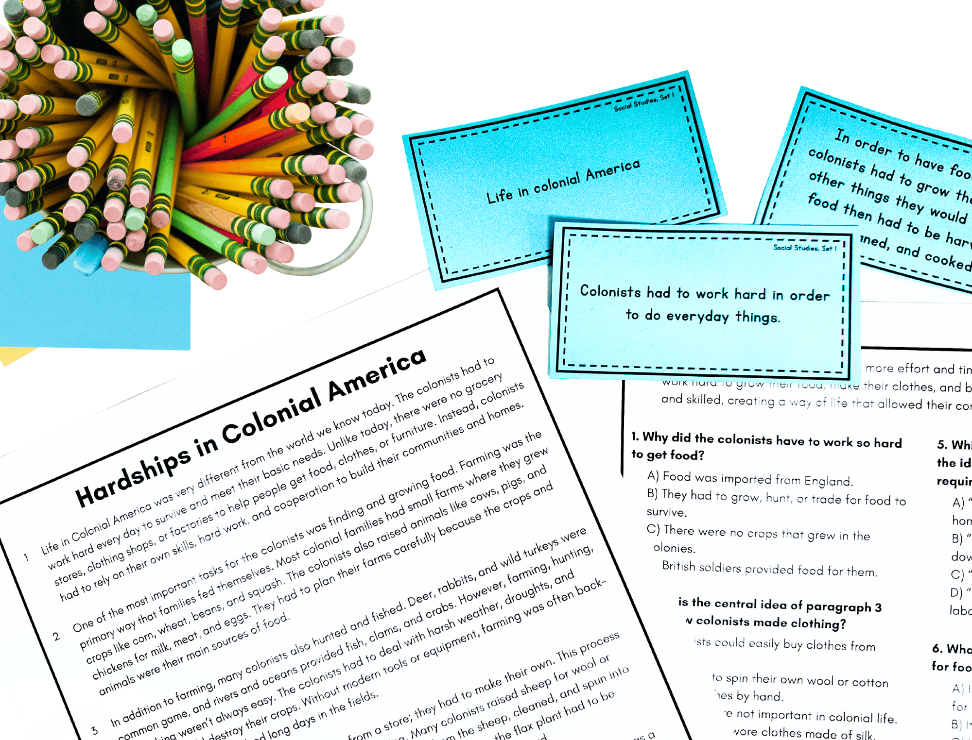 Get students applying their reading knowledge with this FREE set of differentiated passages, multiple choice and short answer questions, and main idea task - all about the hardships in Colonial America.