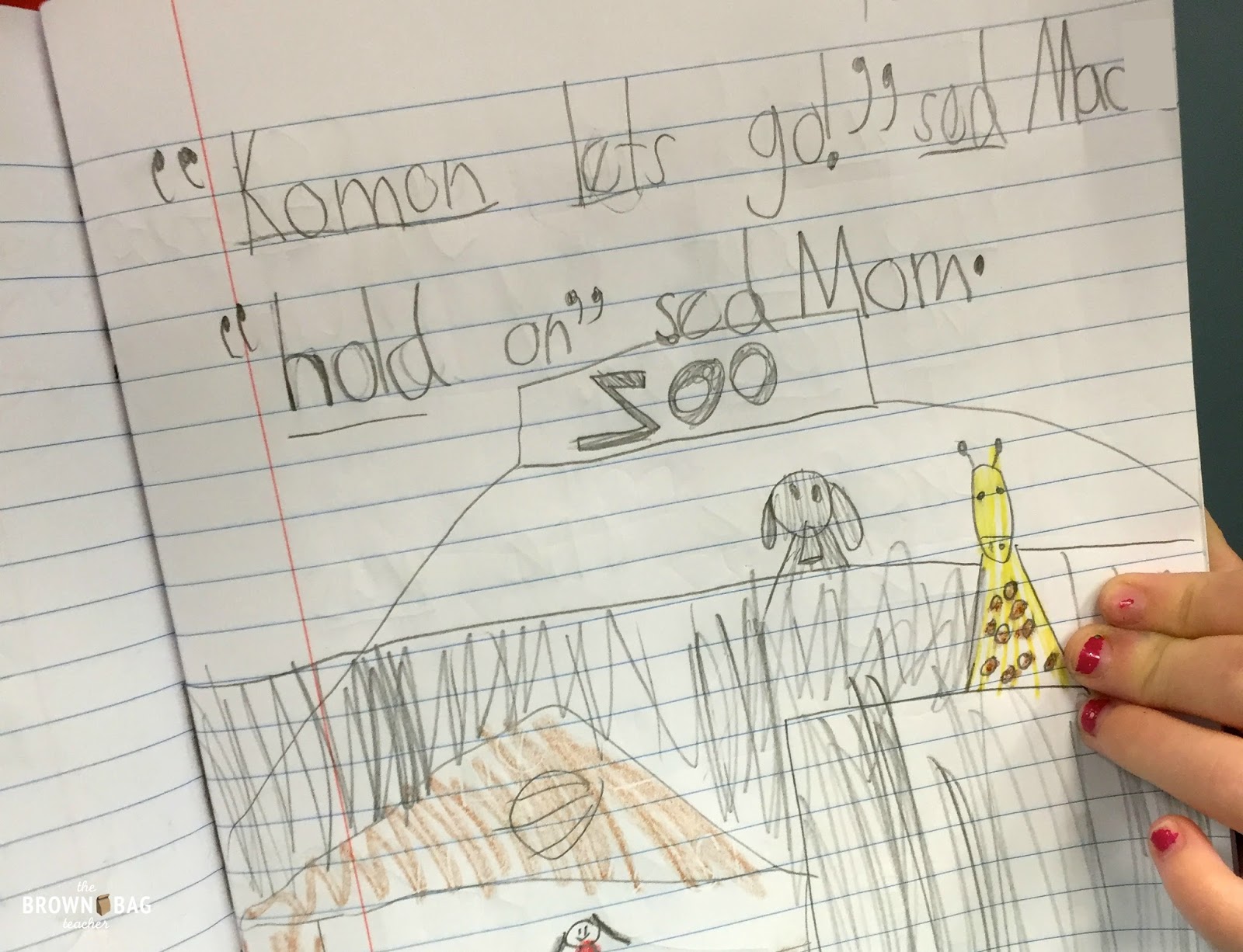 With mentor texts, I love seeing my friends make us parts of the original text in their own writing. Before we publish a piece, we are careful about changing out these parts but for many students it’s a just-right starting place. You’ll notice this friend loved the suspense that the first page created with shorter sentences. (Note – this was a very first draft and we have not looked at punctuation – ha!)